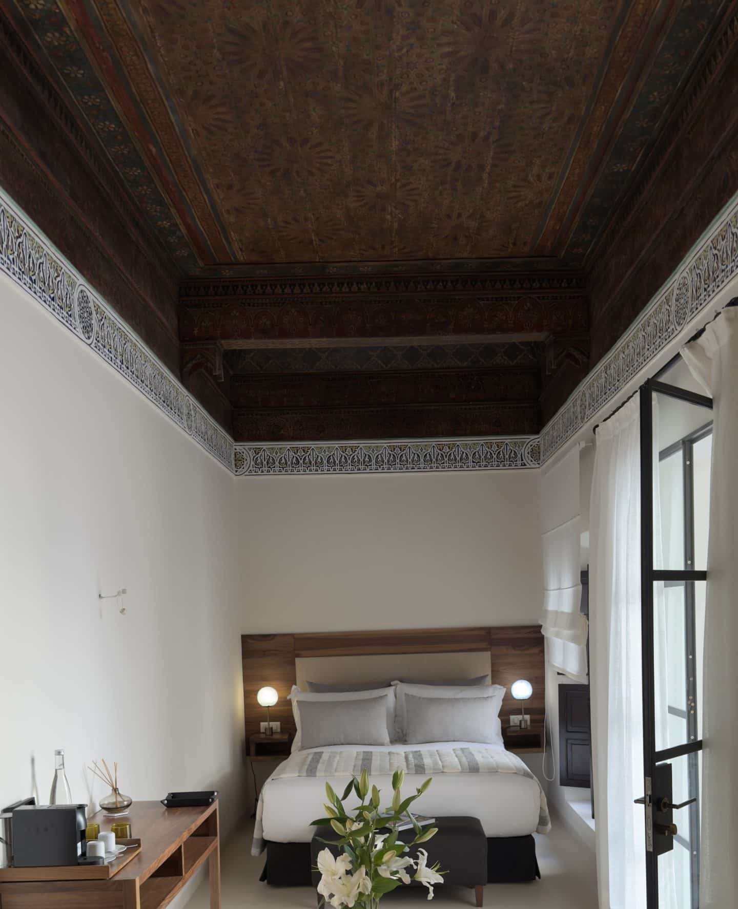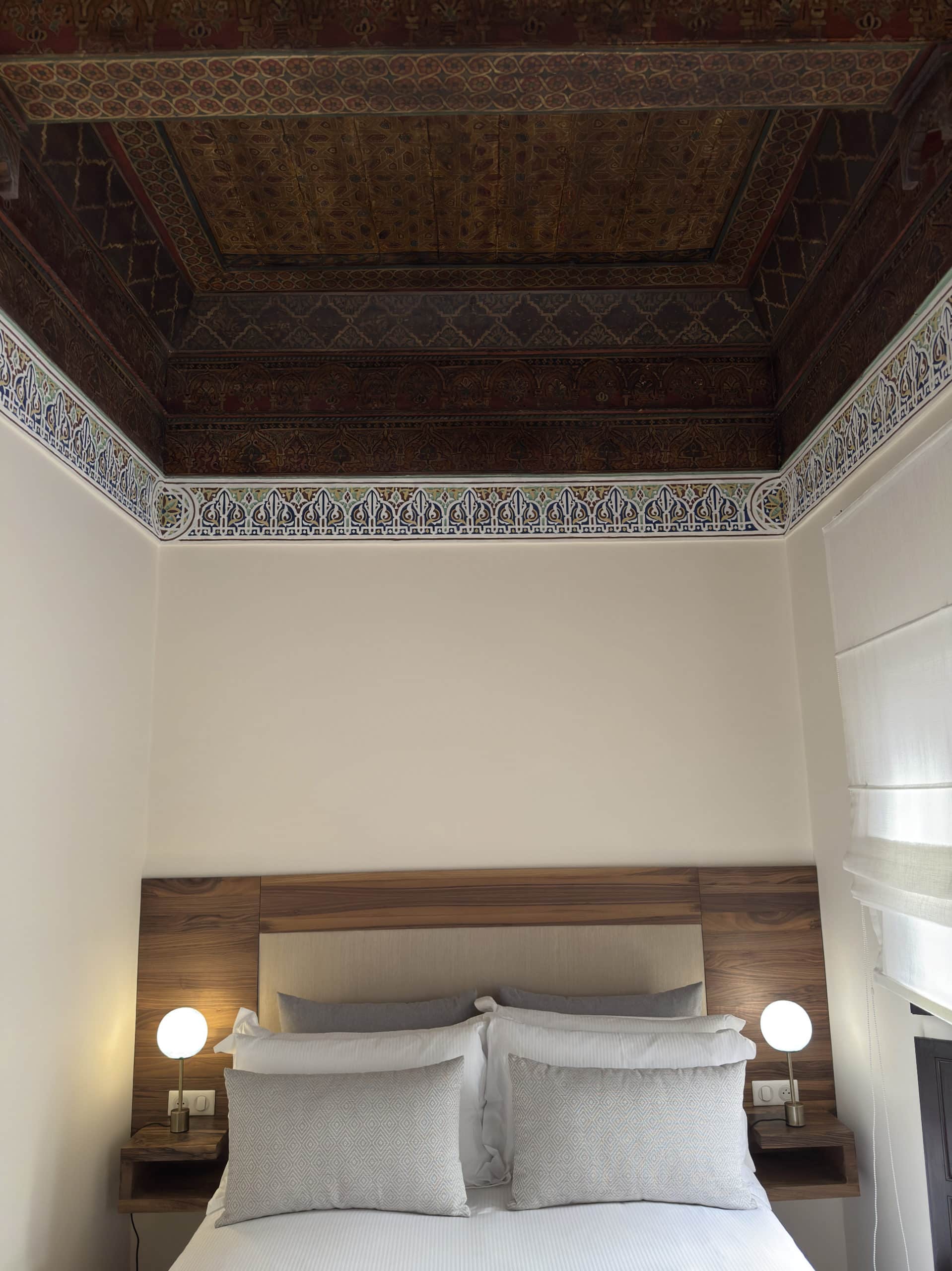 Ses portes Rtaj en cèdre, soulignées de zouak aux pigments profonds, s’ouvrent sur un espace intime baigné de senteurs boisées. Le plafond, lui aussi en cèdre peint, déploie ses motifs comme un ciel sacré suspendu au-dessus du lit.