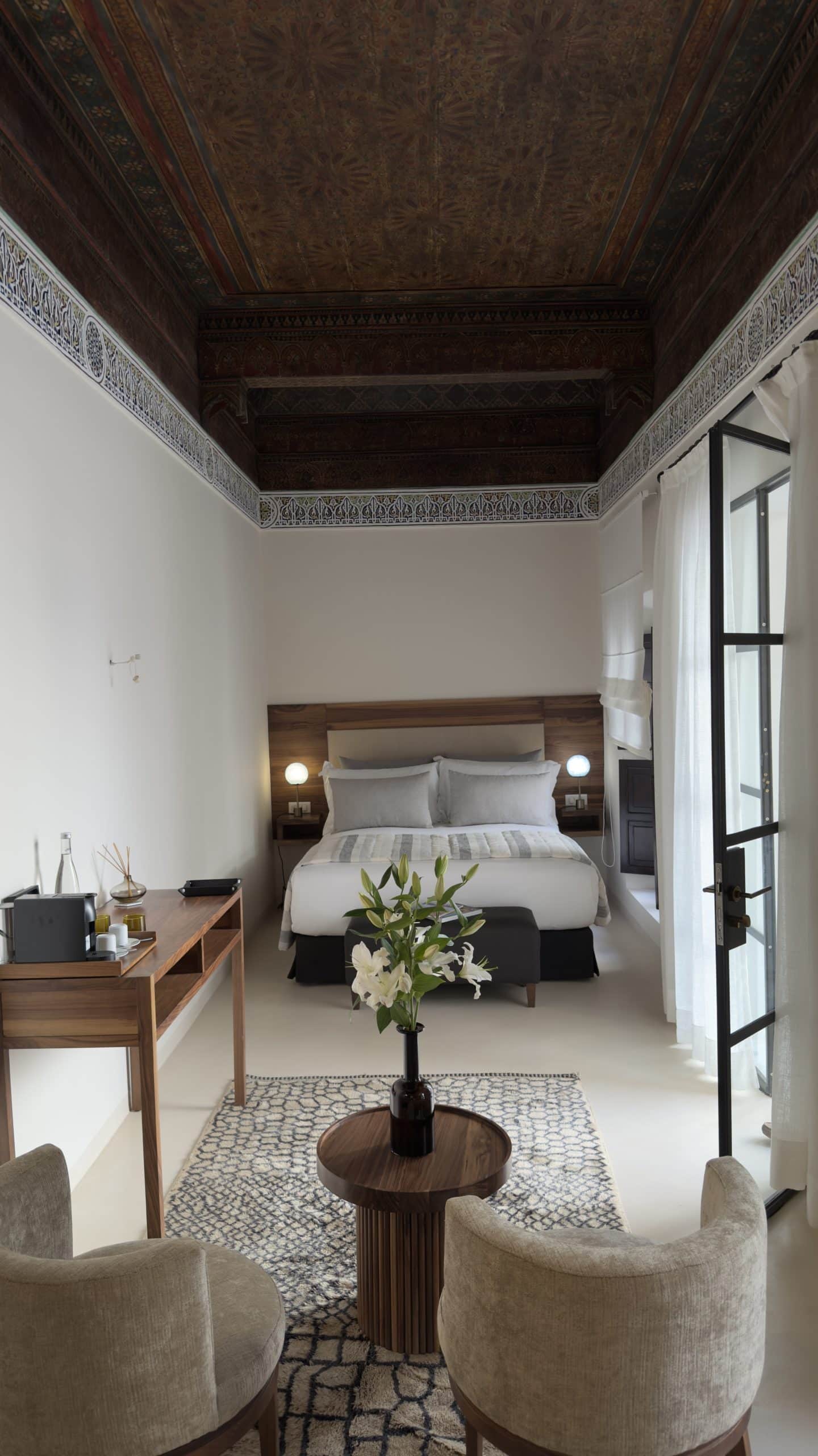 Une suite suspendue entre ciel et terre où chaque détail, du plafond en cèdre, à la décoration en zelliges de la salle de bain raconte une histoire de beauté, de calme et de raffinement.