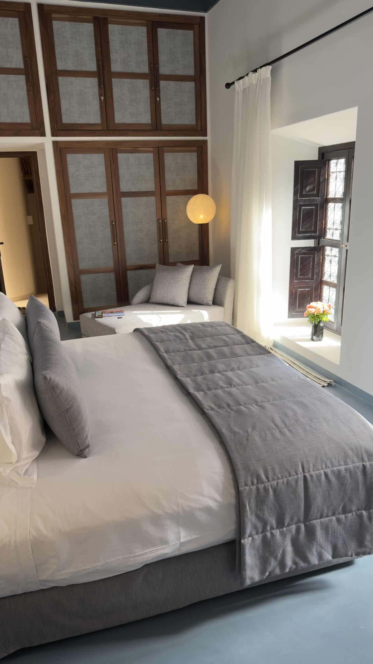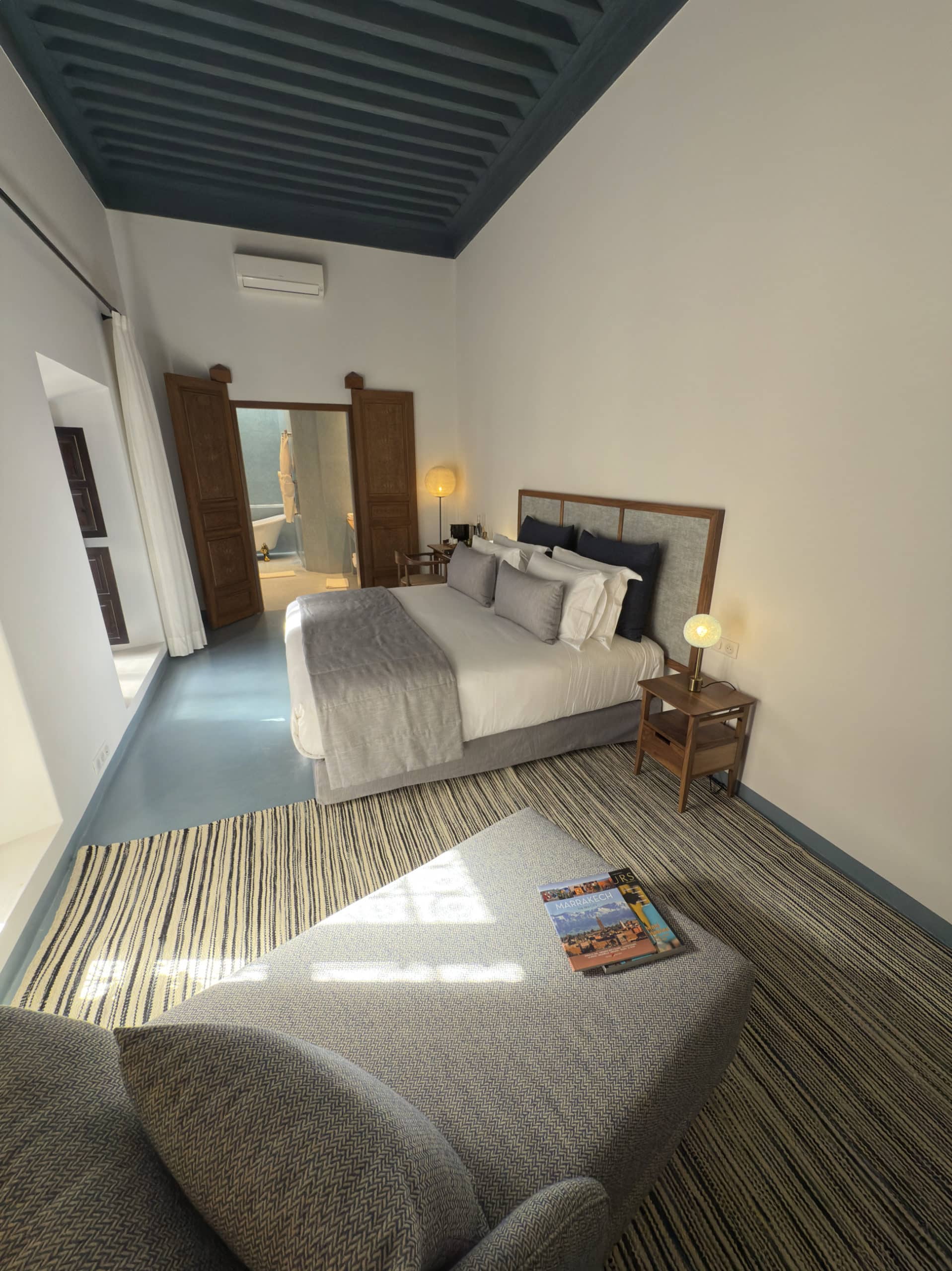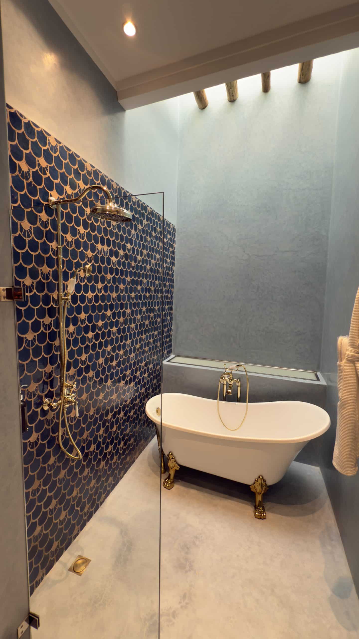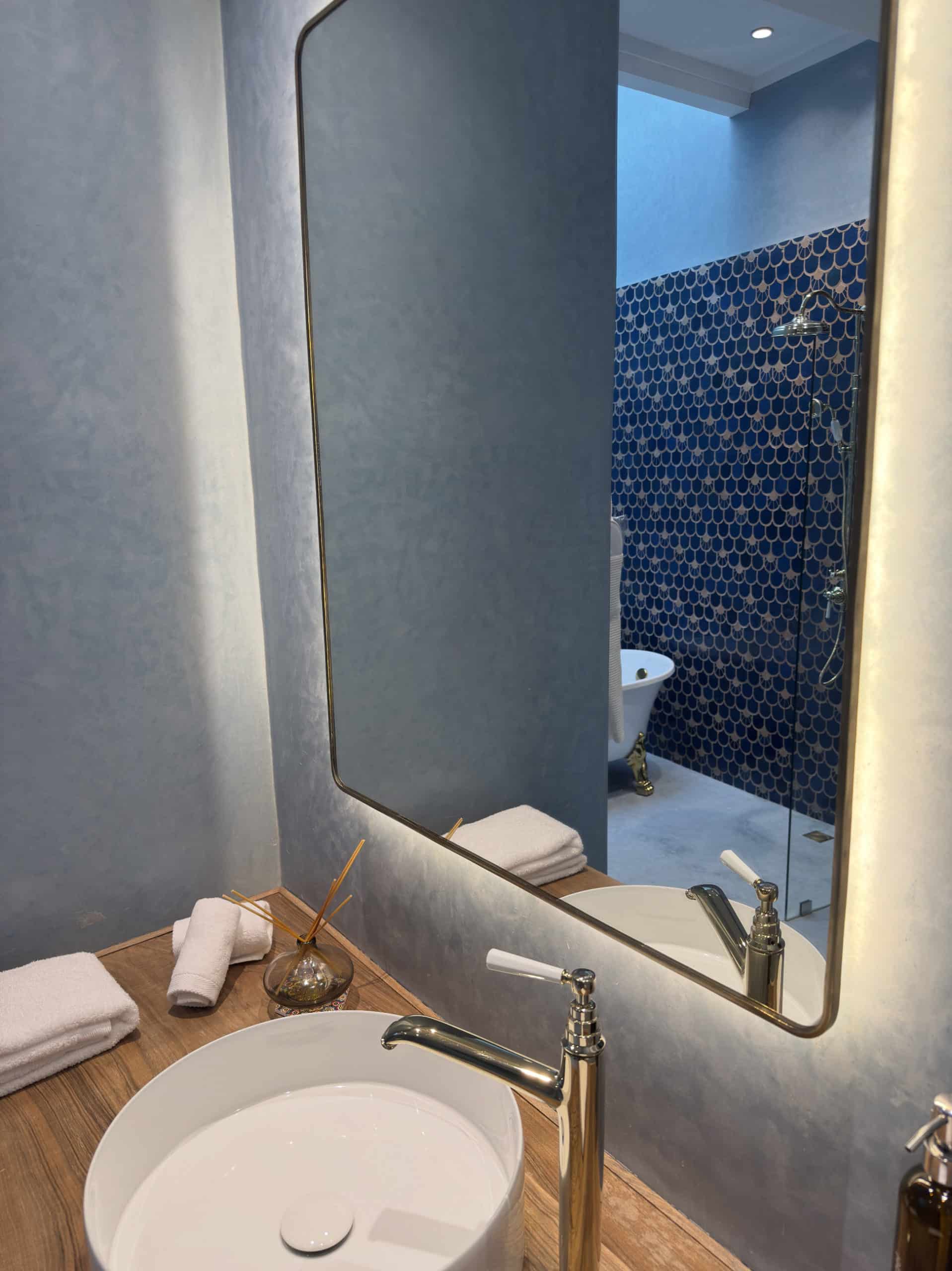 Entrez dans un monde de nuances profondes et apaisantes, où l’indigo décline ses variations les plus élégantes. L’espace a été meublé pour profiter d’une atmosphère douce et enveloppante de lumière naturelle. La salle de bain révèle une mosaïque de zelliges bleus réalisée à la main, sublimée par un puits de lumière qui fait vibrer chaque reflet. Entre ciel et eau , cette salle de bain dispose d’une baignoire délicate et d’une douche spacieuse, pensées pour un véritable rituel de bien-être.
