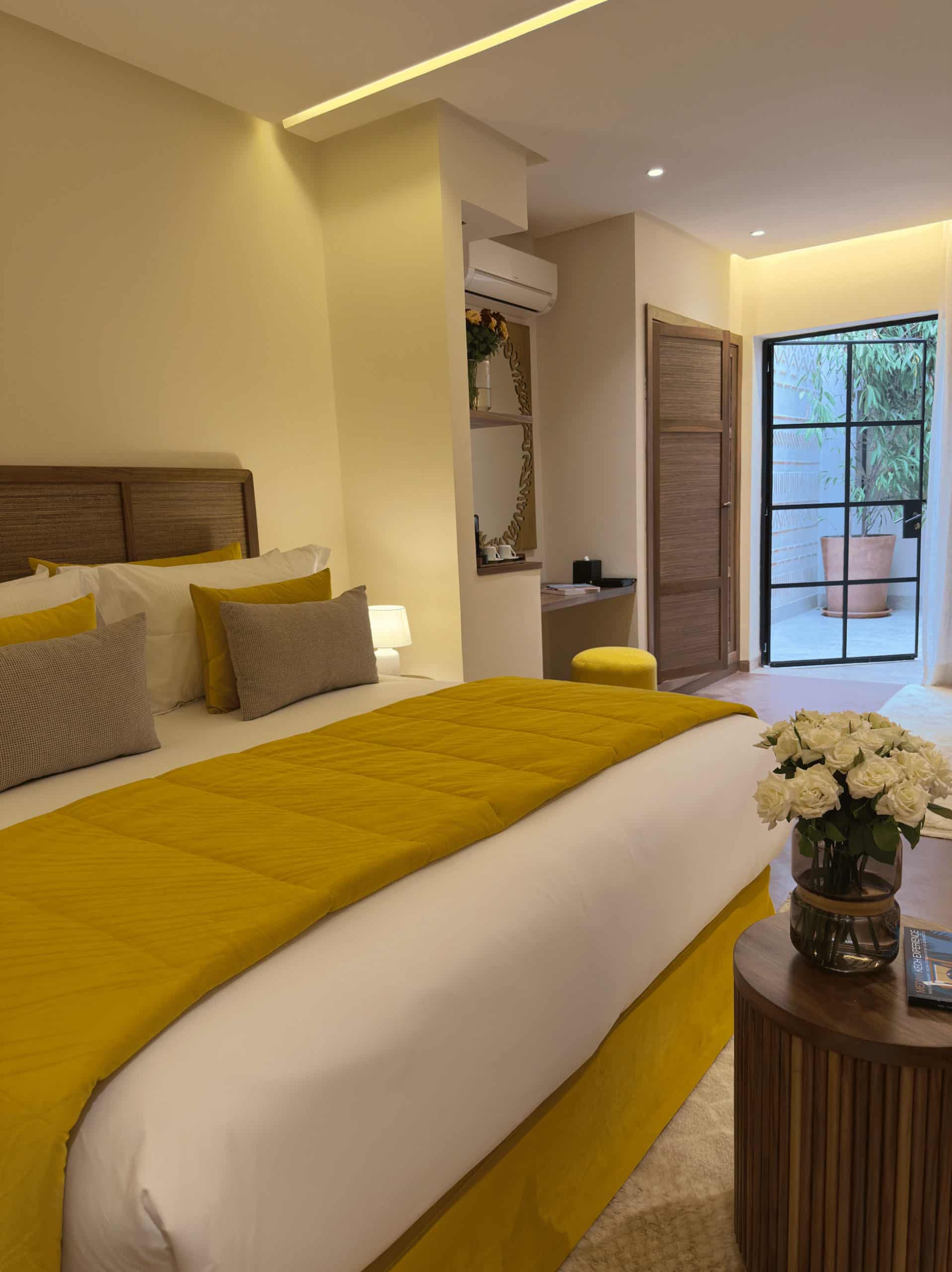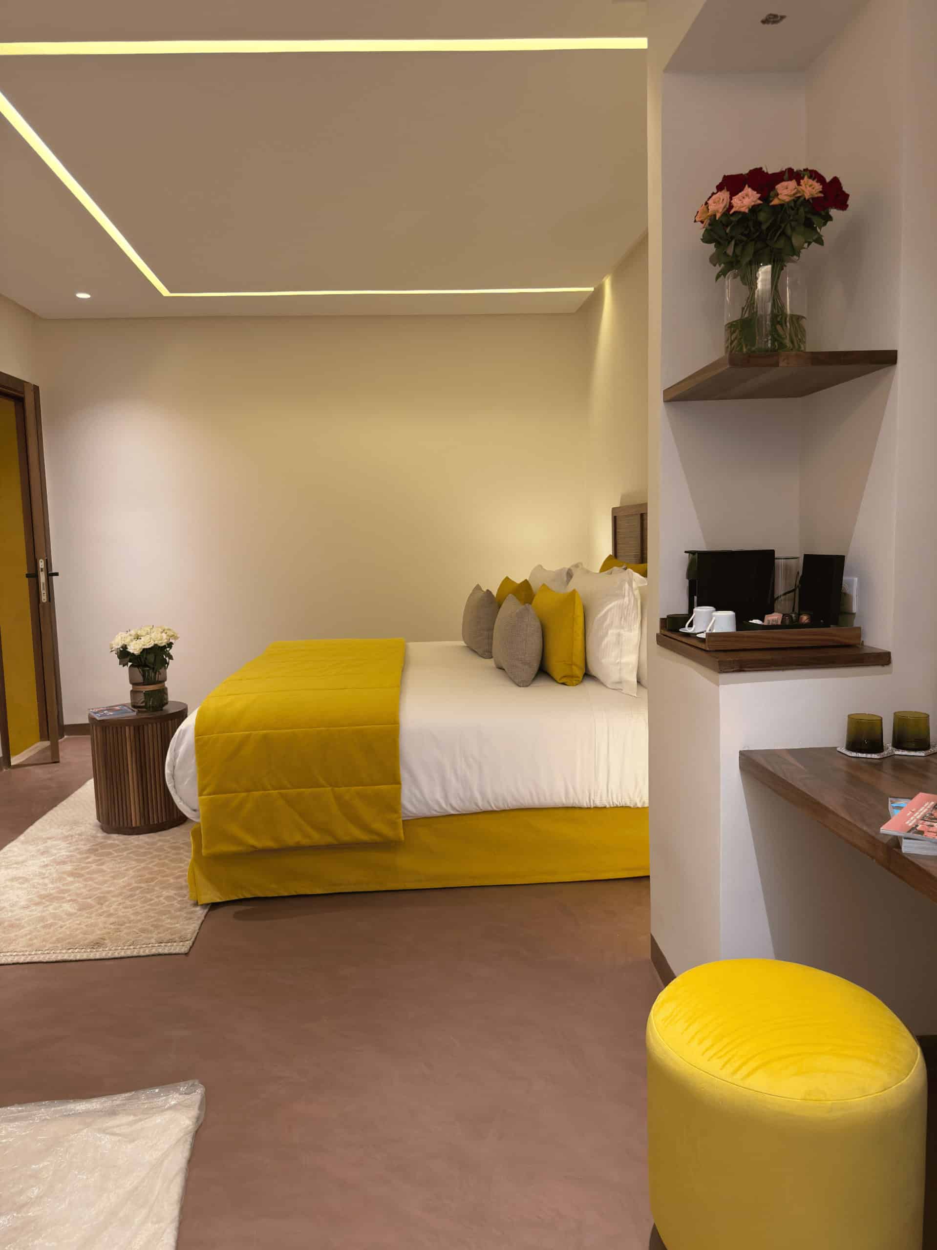 En descendant quelques marches, la salle de bain couleur du soleil prend l’allure d’une grotte dorée, intime et apaisante, propice à la déconnexion. Chaque détail est pensé pour créer une harmonie raffinée, à l’image de Marrakech, entre terre et lumière.