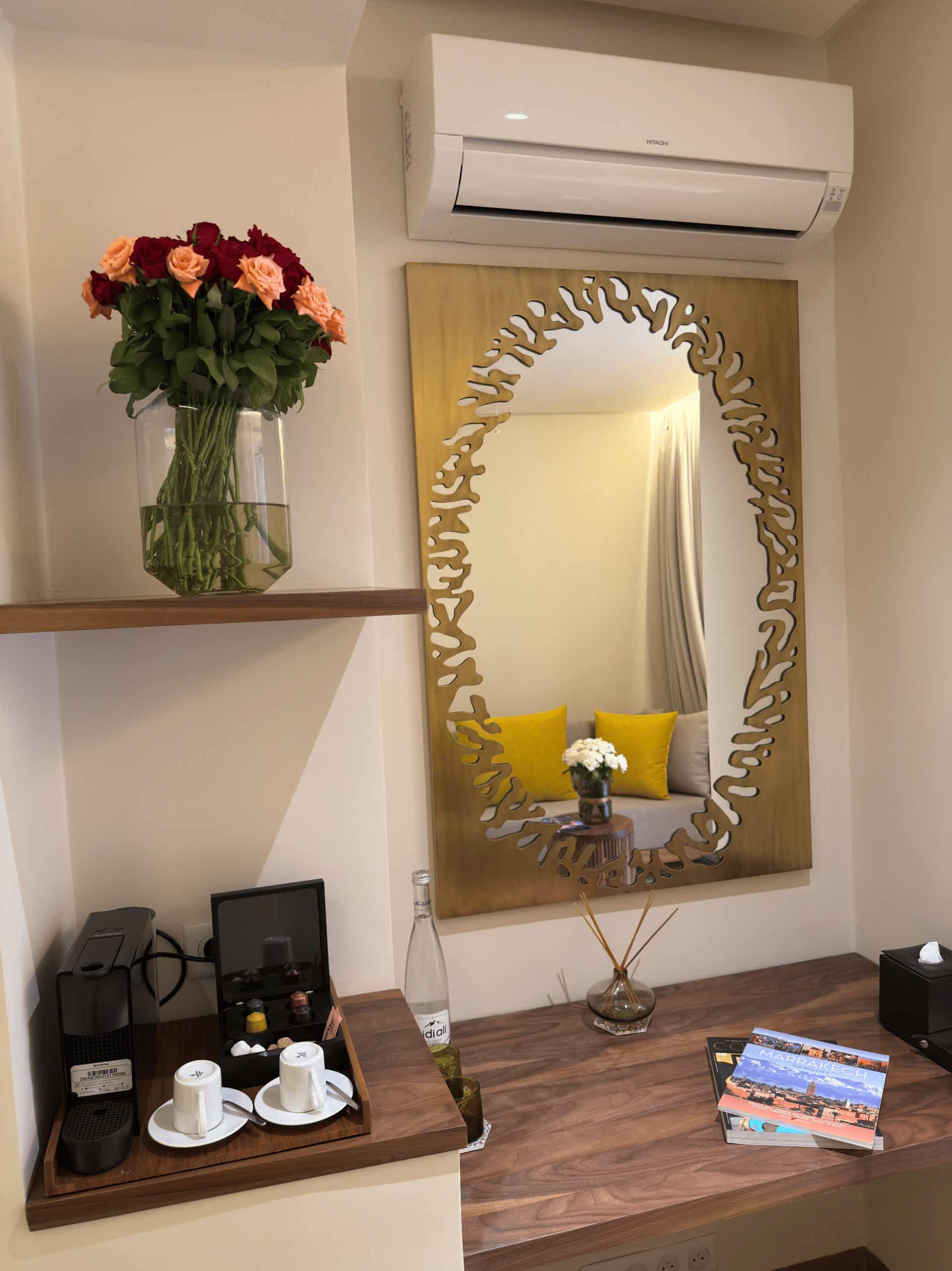 Cette suite élégante aux teintes dorées et « cappuccino » dispose d’un salon, d’un bureau et s’ouvre sur une cour intérieure privée, véritable prolongement de l’espace.